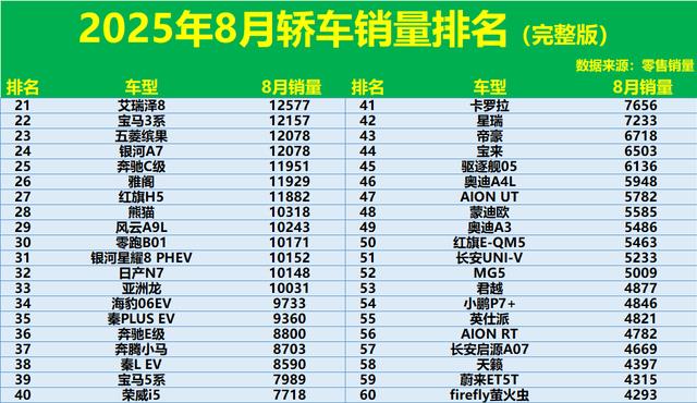 刚刚获悉,2025年8月份轿车零售销量排名完整版正式公布,本期共有218款车型入榜,其中有33款车型破万,新能源车占据主导,而燃油车也实现了稳增。星愿以超4.6万辆的成绩稳居榜首,五菱宏光MINIEV、海鸥等微型电动车依然保持强劲势头。秦PLUS DM、海豹06DM等插混车型也表现稳定,显示出多元动力形式的接受度正在提升。传统燃油车型中,轩逸、朗逸、速腾等合资产品仍守住前列位置,但同比已有放缓迹象。豪华品牌方面,宝马3系、奔驰C级等车型排名中上游,走势平稳。最新!8月轿车销量完整排名:燃油车稳增,轩逸季军,帕萨特第9!