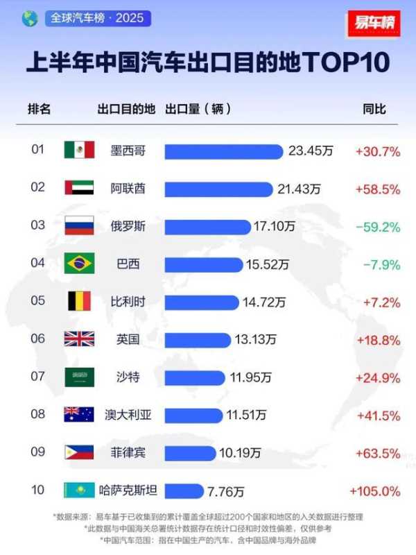 根据易车统计的数据显示, 2025年上半年中国汽车出口目的地前三名分别为墨西哥、阿联酋、俄罗斯,出口量分别为23.45万辆、21.43万辆、17.10万辆, 墨西哥同比增长 30.7%,阿联酋同比增长58.5%,而俄罗斯暴跌59.2%。