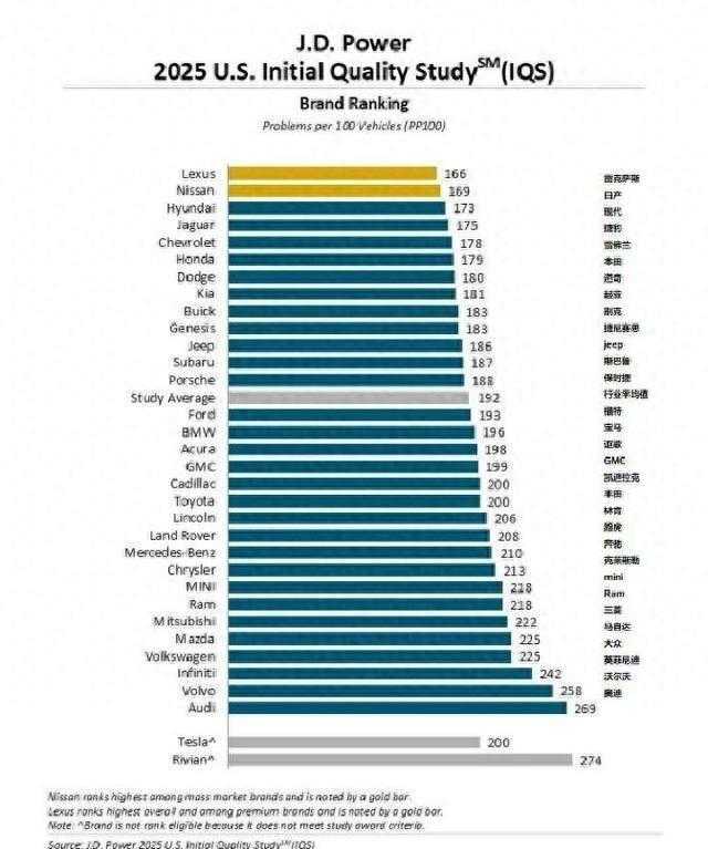 先说结论:在参与统计的34个品牌里,只有大约13个品牌的PP100低于行业平均的192,也就是说,能被称作“问题少”的品牌并不多,比例不到四成。雷克萨斯以166 PP100拿下第一——没毛病,这个牌子长期稳定;更让人意外的是,日产紧跟其后,竟然取代丰田,成了表现最好的平民品牌。现代、捷豹、雪佛兰也挤进前五。跟我年轻时候听到的那套“美系粗糙、日系靠谱”说法,已经不完全对了。