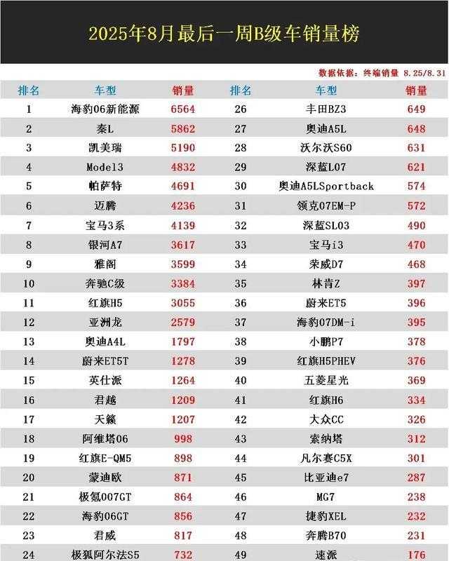 懂车帝最新发布的2025年8月最后一周(8月25日-8月31日)B级车终端销量榜,清晰展现了这一市场巨变:新能源车成为最大赢家,海豹06新能源和秦L直接包揽榜单前两名;凯美瑞则成功“逆袭”帕萨特,拿下燃油B级车销量冠军;特斯拉Model 3凭借环比大幅增长的销量,顺利跻身榜单前四。反观大众旗下的“老将”帕萨特、迈腾,却因后劲不足,仅排在第五、六名。此外,银河A7、雅阁、奔驰C级的销量再度突破3000辆,而曾经的热门车型红旗H5未能进入前十,蒙迪欧、君威、凯迪拉克CT5的周销量更是跌到了千辆以下。