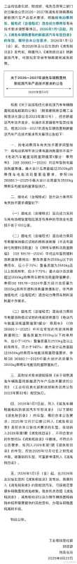 工业和信息化部、财政部、税务总局等三部门近日联合公告2026—2027年减免车辆购置税新能源汽车产品技术要求,明确纯电动乘用车、插电式(含增程式)混合动力乘用车有关技术要求调整等情况。2026年1月1日起,列入《减免车辆购置税的新能源汽车车型目录》的车型,需符合本公告要求。2026年1月1日(含)起,在2026年及以后生效的《减免税目录》发布后,购置列入《减免税目录》的新能源汽车,可按规定享受车辆购置税减免政策。