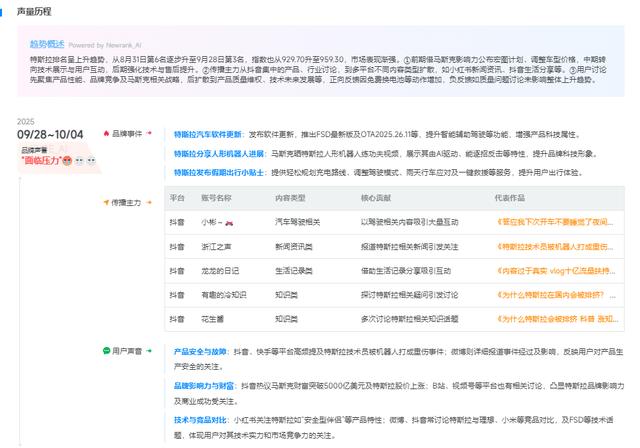 产品安全与故障:抖音、快手等平台高频提及特斯拉技术员被机器人打成重伤事件;微博则详细报道事件经过及影响,反映用户对产品生产安全的关注。品牌影响力与财富:抖音热议马斯克财富突破5000亿美元及特斯拉股价上涨;B站、视频号等平台也有相关讨论,凸显特斯拉品牌影响力及商业成功受关注。技术与竞品对比:小红书关注特斯拉如“安全型伴侣”等产品特性;微博、抖音常讨论特斯拉与理想、小米等竞品对比,及FSD等技术话题,体现用户对其技术实力和市场竞争力的关注。