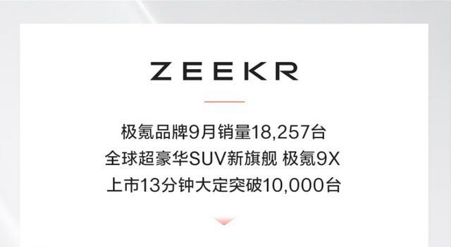 极氪科技公布9月销量为51159台(包括极氪和领克),其中极氪品牌9月销量18257台。极氪今年最具看点的就是极氪9X这台旗舰SUV,新车在9月底正式上市,售价46.59-59.99万元,且上市13分钟大定就突破1万台,通俗点理解,这台极氪9X是极氪乃至吉利汽车旗下最好的SUV!