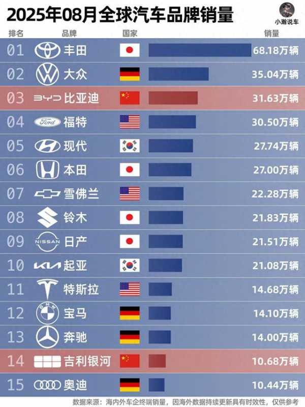 某些品牌慌不慌!8月全球汽车销量榜,比亚迪第3,吉利银河14
