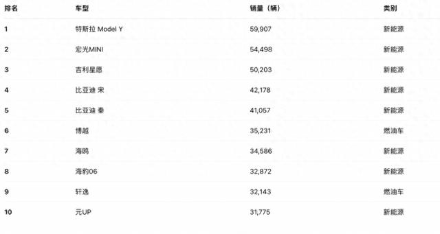 9月乘用车销量前十榜单:Model Y夺冠,吉利和比亚迪是最大赢家