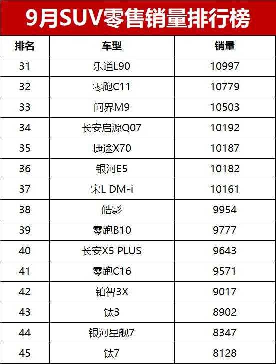 卖爆了!9月SUV零售销量榜完整版,37款车破万,你的爱车排第几?