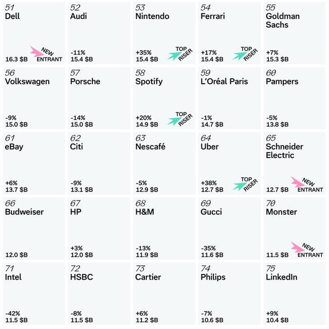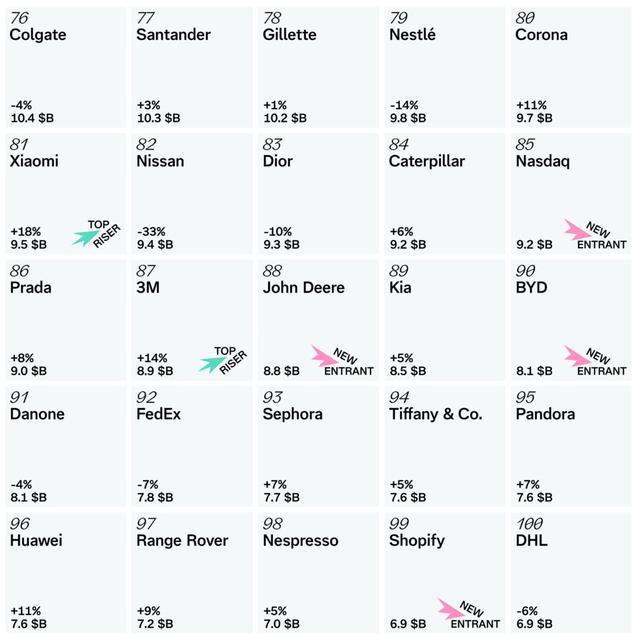 报告中还有一个新晋品牌值得关注,那就是比亚迪。比亚迪以81亿美元的品牌价值位列第90位。英特品牌的全球首席战略官曼弗雷迪・里卡表示:“比亚迪是自特斯拉以来汽车市场最大的颠覆者。 其产品是世界级的,并且在从亚洲基地向外扩张的过程中,在欧洲市场取得了巨大进展。“