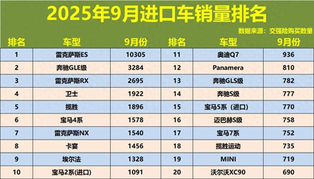 进口车曾经凭借品牌溢价、精湛工艺和独特设计在中国市场占据特殊地位,但随着国产高端车型的崛起,进口车的销量占比正逐年下滑。9月进口车销量数据显示,雷克萨斯ES以10305辆位居榜首,成为唯一月销破万的进口车型;奔驰GLE级、雷克萨斯RX月销在2600-3300辆区间,位居第二梯队。值得关注的是,传统豪华品牌如保时捷卡宴、路虎揽胜等车型月销均不足2000辆,而超豪华品牌如劳斯莱斯、法拉利等月销更是仅有个位数。这种销量分布反映出,进口车市场正在从大众豪华向小众个性化转变,其市场地位也面临着前所未有的挑战。有点惨!9月进口车销量排行:第一不可撼动,GLE亚军,奥迪Q7第11!