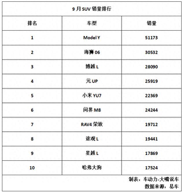 9月SUV销量榜:Model Y断层领先,海狮06稳居第二