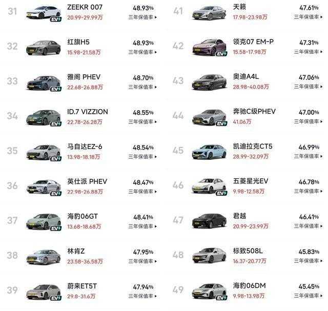 雅阁与凯美瑞依然稳坐前列,分别保持在59。25%与57。66%的保值率区间。对广大家庭而言,成熟的技术配合长期稳定的口碑,使得它们持续在二手车市场被追捧。日系B级车的持久魅力,从未低调过。极氪007与Model3新能车型开始浮现,但与传统燃油阵营的差距还未被彻底抹平——新能源尚处于试探阶段。