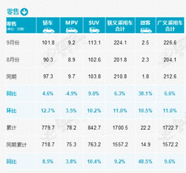 乘联会数据显示,9月全国乘用车市场零售224.1万辆,同比增长6.3%,环比增长11.0%,“金九”效果凸显。今年以来累计零售1700.5万辆,同比增长9.2%。