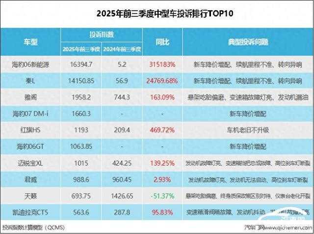 霸榜2025年前三季度中型车投诉指数排行:两姊妹车强势