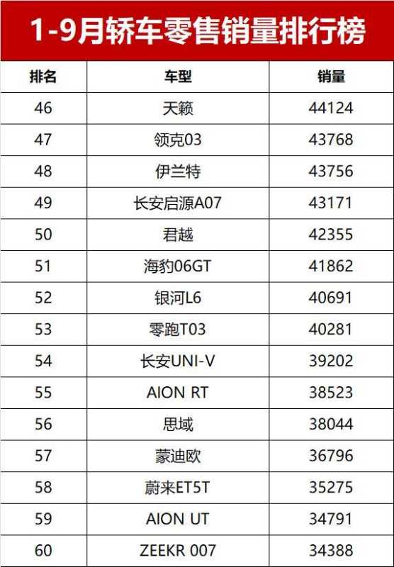 前三季度轿车销量榜,第1-260名,星愿夺冠,26款车超10万辆
