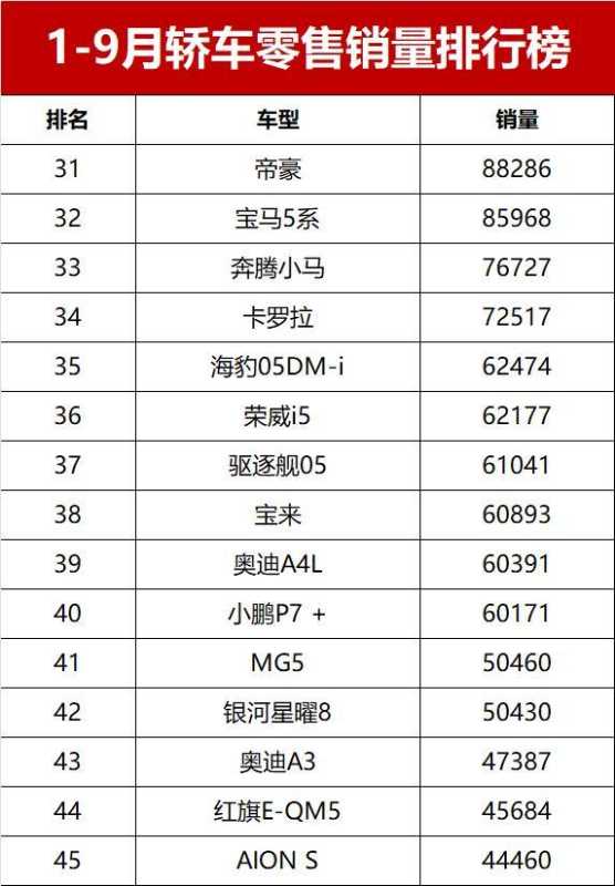 【2025年1-9月轿车零售销量排行榜 完整版】近日,乘联会公布了2025年前三季度乘用车销量数据。数据显示,2025年1-9月国内轿车市场累计零售销量780.0万辆,同比增长8.5%,在汽车以旧换新政策持续显效与新能源车型强势拉动下,市场呈现稳健增长态势。前三季度销量突破10万辆的轿车达到26款车型,其中超过20万辆的车型有8款。新能源车型持续领跑市场,包揽榜单前四名且前十席中占据七席;燃油车虽整体占比下滑,但仍有核心车型保持竞争力,日产轩逸夺得燃油轿车销冠,同时也是销量最高的合资燃油轿车车型。前三季度轿车销量榜,第1-260名,星愿夺冠,26款车超10万辆!