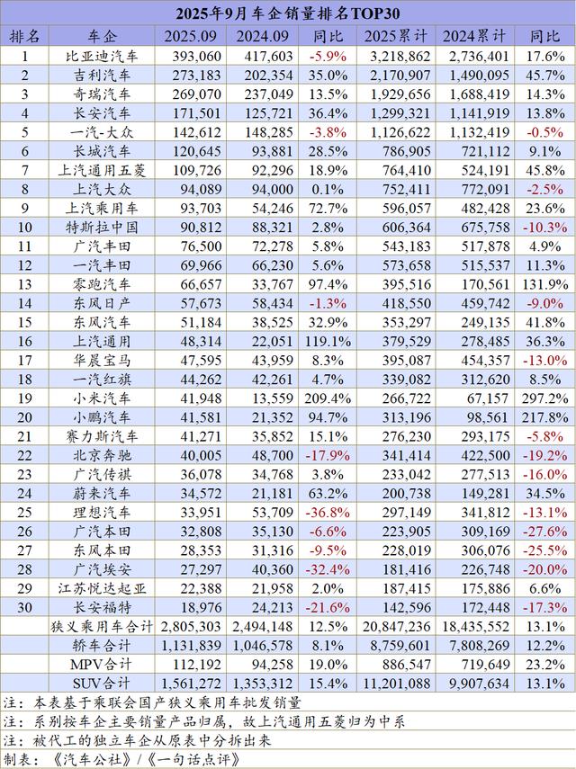 9月份吉利同比增35.0%、长安增36.4%、奇瑞增13.5%,三家以“双位数增幅+百万级累计”形成头部自主的第二梯队。其中吉利前9月累计217.1万辆,同比增幅45.7%居自主四强之首,“燃油+新能源”双细分市场驱动效应显著。