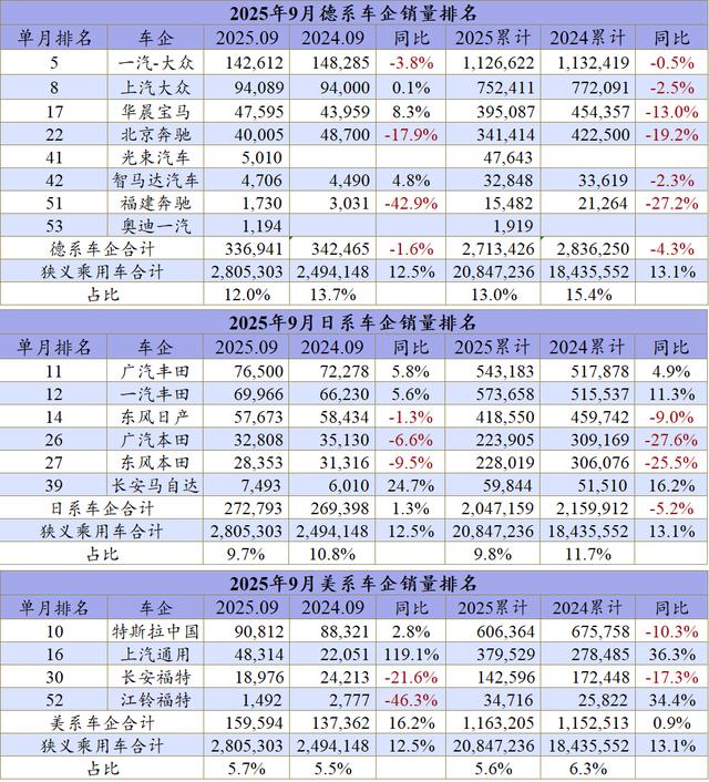 德系依赖“豪华品牌单点突破”(华晨宝马领跑增长势头),但大众双雄(一汽-大众-3.8%、上汽大众+0.1%)增长乏力,累计仍处下滑通道。特别是从累计来看,所有德系品牌均未实现增长,特别是奔驰,下跌幅度最大,导致德系车前三季度累计跌幅超过4.3%。