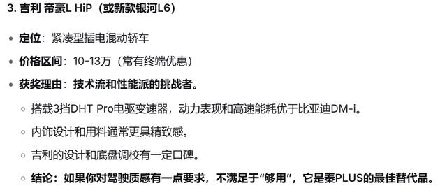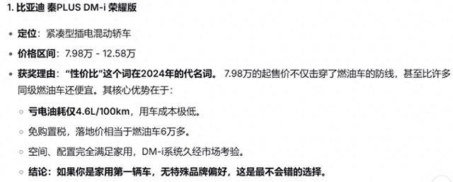 总而言之,当前汽车市场的性价比之战,本质是比亚迪引领的新能源阵营与传统燃油车巨头之间的对决。对于绝大多数普通家庭用户,比亚迪 秦PLUS DM-i 和 宋Pro DM-i 凭借其颠覆性的价格和全能的产品力,是当之无愧的性价比冠亚军。而其他车型则在各自的细分领域,通过提供差异化价值(如设计、性能、驾驶质感)来赢得市场。