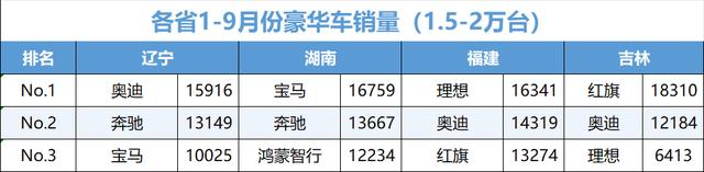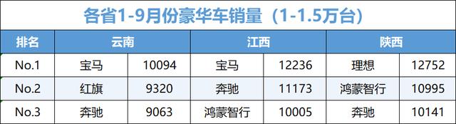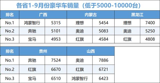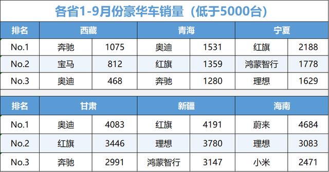 这些省份因为人口稀少,销量本身就不高,BBA主导,出现了多个红旗的身影,蔚来终于在海南拿了第一。