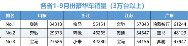 终极BOSS,这几个人口大省加上经济强省,自然是豪华车的主力军,广东的是华为的大本营,旗下鸿蒙智行销量破6万,的确实现了遥遥领先;江浙也突破五万辆。