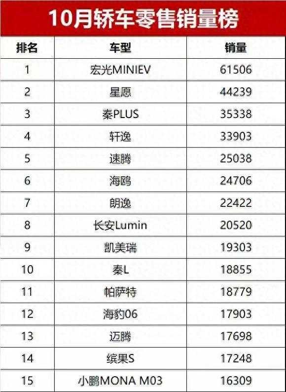 10月份“最好卖的”十大轿车:宏光MINIEV夺冠,朗逸跌到第七?