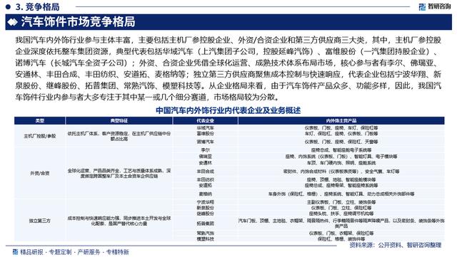 市场竞争格局:我国汽车内外饰行业参与主体丰富,主要包括主机厂参控股企业、外资/合资企业和第三方供应商三大类,其中,主机厂参控股企业深度依托整车集团资源,典型代表包括华域汽车(上汽集团子公司,控股延峰汽饰)、富维股份(一汽集团持股企业)、诺博汽车(长城汽车全资子公司);外资、合资企业凭借全球化运营、成熟技术体系布局市场,核心参与者有李尔、佛瑞亚、安通林、丰田合成、丰田纺织、安道拓、麦格纳等;独立第三方供应商聚焦成本控制与快速响应,代表企业包括宁波华翔、新泉股份、继峰股份、拓普集团、常熟汽饰、模塑科技等。从企业格局来看,由于汽车饰件产品众多、功能多样,因此,我国汽车饰件行业内参与者大多专注于其中某一或几个细分赛道,市场格局较为分散。