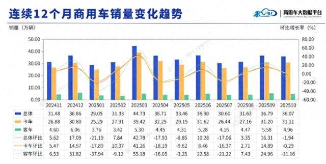 最新数据显示(中汽协商用车专业委员会),2025年1-10月我国商用车累计销量(批发)为347.24万辆,已经逼近350万辆的大关,同比增长了8.84%。