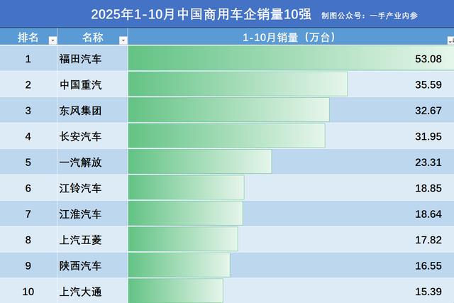 2025商用车1-10月销量10强:福田53万辆,重汽超东风,解放排第5