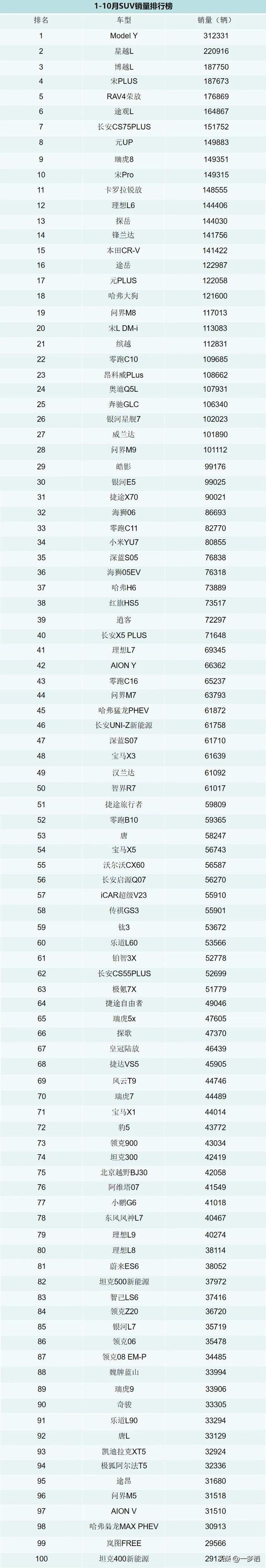 - 再次大胜!1-10月SUV销量榜:国产车前10占7,博越季军,CR-V第15