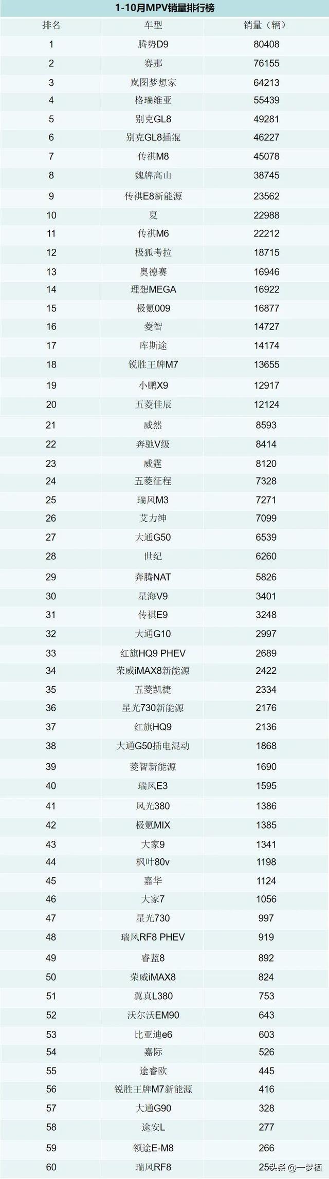 MPV市场车型较少,格局相对来说比较稳定,值得一说的就是魏牌高山,它的表现和腾势D9恰恰相反,自从5月换新之后,销量大幅提升的同时更是呈现月销递增趋势,9月拿下MPV月销亚军,10月夺得MPV月销冠军,但由于该车5月份之前销量比较拉胯,拉低了总销量,今年前10个月累计销量38475辆,排在第8位。