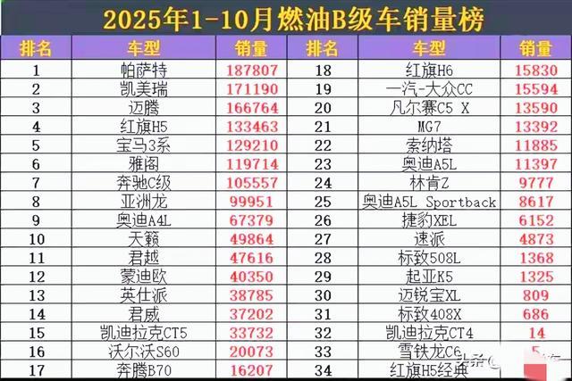 得B级车者得天下,这句话放在现在仍然不过时。2025年1月至10月的燃油B级车市场销量榜展现了传统合资品牌的优势地位。从具体数据来看,德系和日系品牌的主力车型表现较好。其中帕萨特销量超过了18万辆,达到187,807辆,居销量榜首;凯美瑞紧随其后,销量也突破了17万辆大关,达到171,190辆;一汽-大众迈腾同样表现不俗,销量超过16万辆,具体为166,764辆。这三款车型可以说是火了很多年。