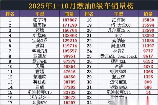 先把风险摆出来,再谈收益。燃油B级车市场看似稳固,但谁能保证明年还握有这半壁江山?我们盯着那份2025年1-10月的销量榜单,最刺眼的数字并不是帕萨特以18.7万辆逆袭夺冠,而是索纳塔不足1.2万辆的惨淡成绩。