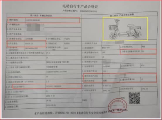 产品合格证:新国标电动车“一车一证”。需要仔细核对上面的产品型号、整车编码等信息是否与实车完全一致。
