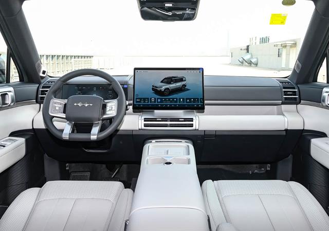 和豹5、坦克300相比,钛7内部座椅的坐姿相对较低,感受更接近普通的城市SUV。再加上方盒子造型本身的优势,前、后排的头部空间,要比普通城市SUV宽裕很多,坐进车内明显感觉要更敞亮。