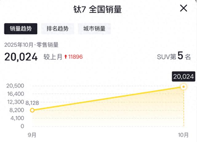 9月上市的方程豹钛7,当月零售量就突破8千辆,而首个完整销量月份的10月,零售量直接跨过2万辆大关。在当月所有SUV榜单中挤进前五,同时也成为插混SUV类别断档领先的销量第一。