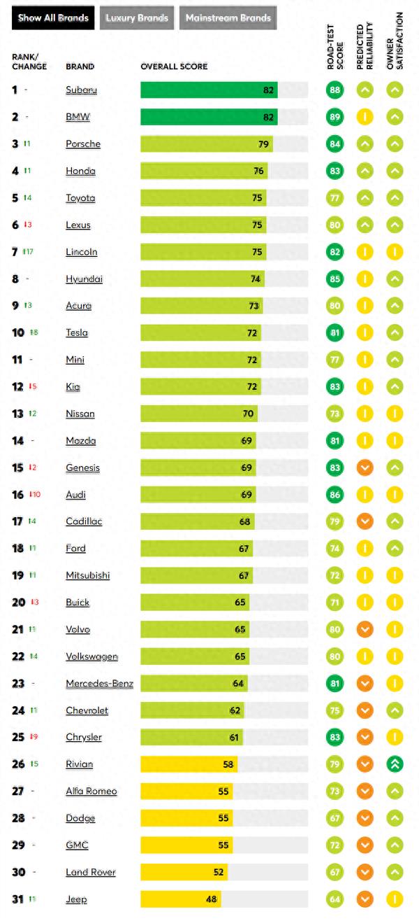 榜单排名由《消费者报告》对31个品牌的汽车,在可靠性、车主满意度、安全性和路试得分等方面进行综合评分。