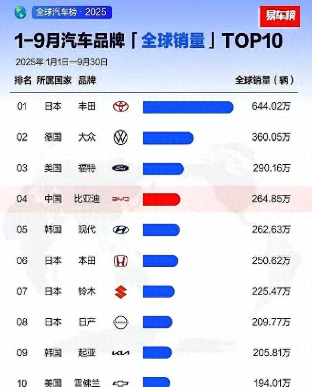丰田和大众这对"老搭档"还是牢牢占据着前两名的位置,稳得像两座不会倒塌的堡垒。不过,从第三名开始,整个画面就完全变了样。