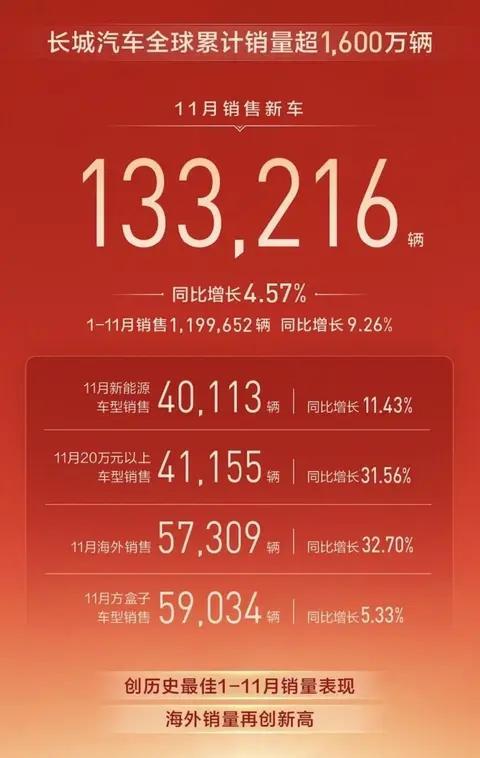 一汽集团前11个月累计销量为299.5万辆,目标完成度为86.81%。红旗品牌累计销量突破42万辆,同比增长9.2%。
