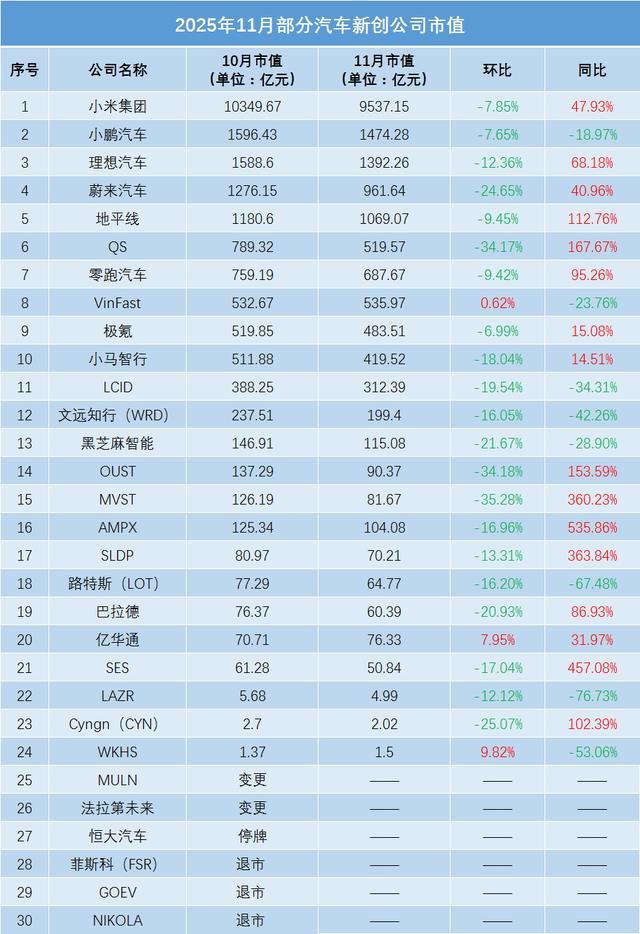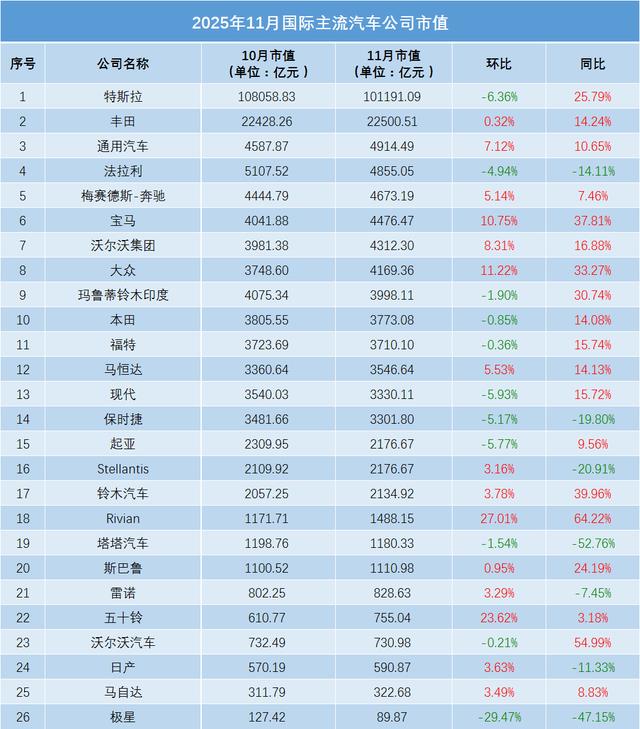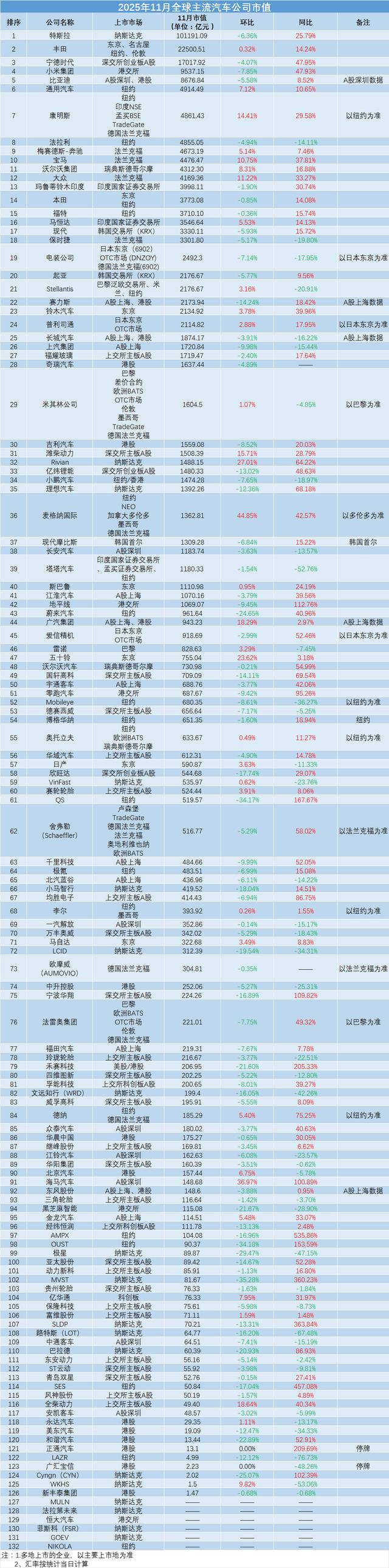 2025年11月《中国汽车报》汽车市值研究组继续对全球汽车类上市公司月度市值变化进行全面跟踪、梳理和比较分析。并基于2024年全年的数据积累基础上,对全球汽车类上市公司的年度市值表现进行总结,并对2025年市值变化趋势进行预判。为读者提供更丰富、更详实、更客观、更多元、多维度的市值变化数据分析。