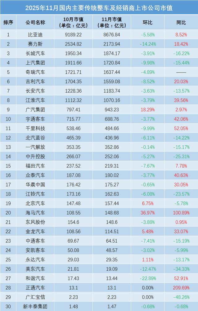 紧追其后的赛力斯11月末总市值达2173.94亿元,环比降14.24%,同比增18.42%。11月5日,赛力斯在香港联交所主板上市,实现“A+H”两地上市。当日赛力斯港股收盘价为131.5港元/股,市值2290.7亿港元。据悉,赛力斯本次募资净额达140.16亿港元,是迄今为止规模最大的中国车企IPO,也是2025年以来全球规模最大的车企IPO。在H股成功募资,反映出投资者对赛力斯未来发展潜力的看好,也凸显出市场对中国汽车行业的高度关注与信心。