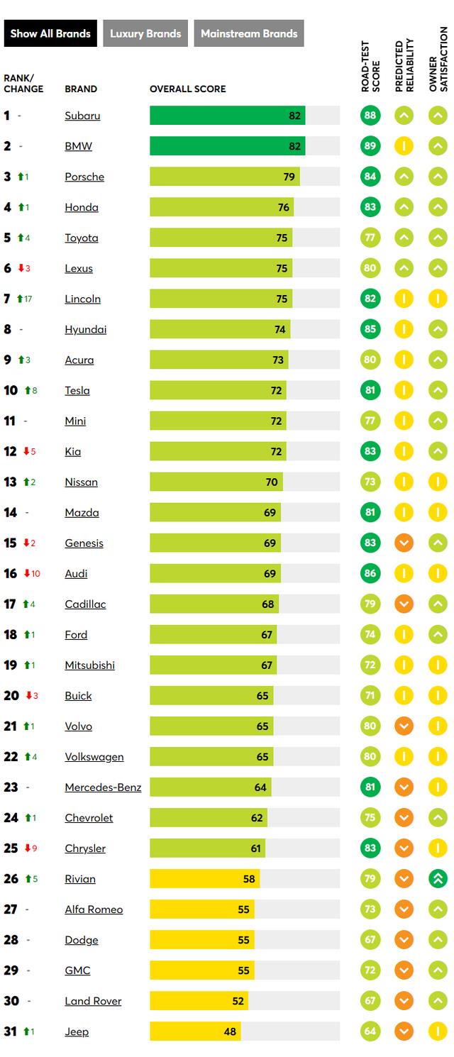 我们仅将测试过至少两款现有车型的制造商纳入品牌排名。因此,菲亚特、英菲尼迪、捷豹、Lucid、玛莎拉蒂、Polestar 及 Ram 品牌未在此榜单中出现。