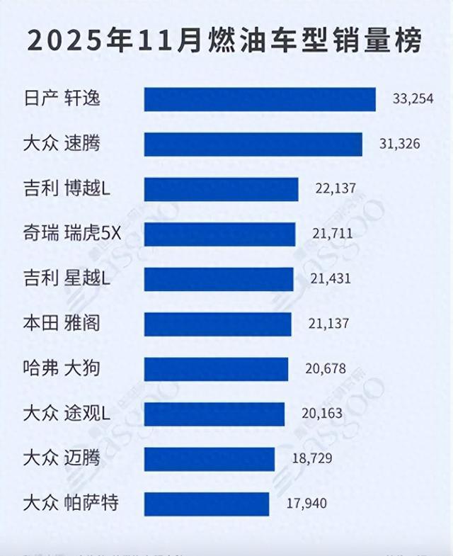 11月最好卖的十大燃油车:轩逸狂甩3万3台,博越L挤进前三