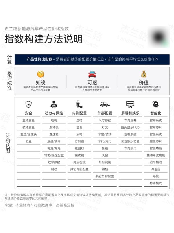 根据机构官方信息,杰兰路性价比指数的核心计算公式为:消费者感知的配置价值总和 ÷ 车型终端平均成交价格(TP)。其评估体系涵盖安全、动力、内饰、智能化等六大维度超40项具体配置,强调配置对消费者的“可感知性”与“价值认可度”。