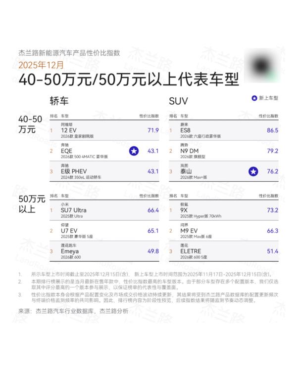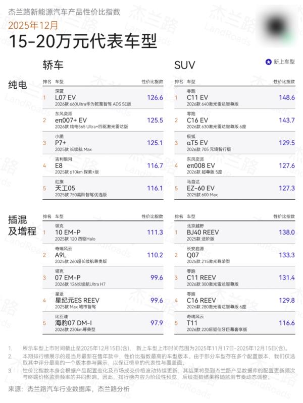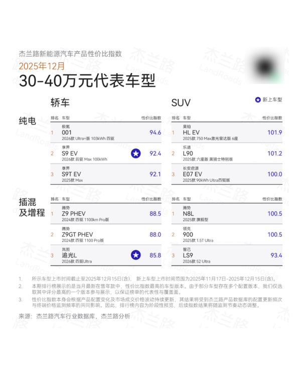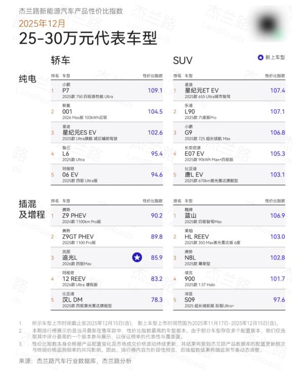 【CNMO科技消息】12月29日,杰兰路汽车行业数据发布了2025年12月新能源汽车产品性价比指数排行榜。榜单覆盖了从5万元以下到50万元以上共七个主流价格区间,并细分轿车、SUV的纯电及插混/增程车型,为消费者年底购车提供了极具参考价值的“值购指南”。