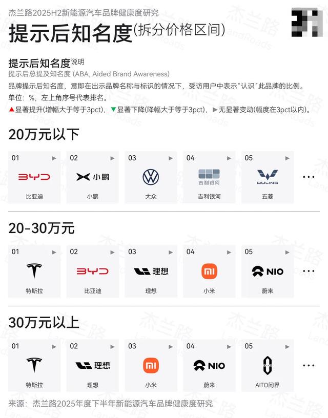 先从大家伙最敏感的价格方面上看排名。20 万元以下区间位列前五的依次为比亚迪、小鹏、大众、吉利银河与五菱。要不说还得是比亚迪呢。在 20-30 万元区间的排名倒有些明显变化,分别为特斯拉、比亚迪、理想、小米与蔚来。说实话,小雷日常通勤上班的时候,的确没少见这些个品牌汽车。接下来是 30 万元以上的,分别是特斯拉、理想、小米、蔚来与问界。