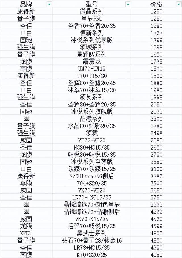 新手想选到合适的膜,首先确定预算和种类:根据预算和车型(燃油车/新能源),先锁定种类。预算一般无论是新能源车还是油车,首选陶瓷膜;预算充足的新能源车建议光谱选择膜(光学膜)或者顶级磁控溅射金属膜+侧后陶瓷膜;预算非常充足直接全车顶配磁控溅射金属膜。