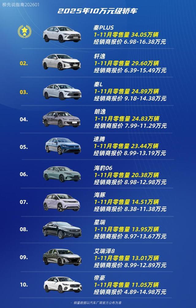车型销量数据直观地反映了市场竞争态势。2025年1-11月,10万元级轿车TOP10车型累计零售量均在10万台以上,排名前五的车型均超过23万台。具体来看,排名前五的车型分别为:秦PLUS、轩逸、秦L、朗逸以及速腾。其中,比亚迪秦PLUS以34.05万辆的累计零售量稳居榜首;秦PLUS和秦L双双进入前五,显示了电动化趋势已深入主流市场;其次,传统合资车型如轩逸、朗逸、速腾依然保持一定的竞争力。