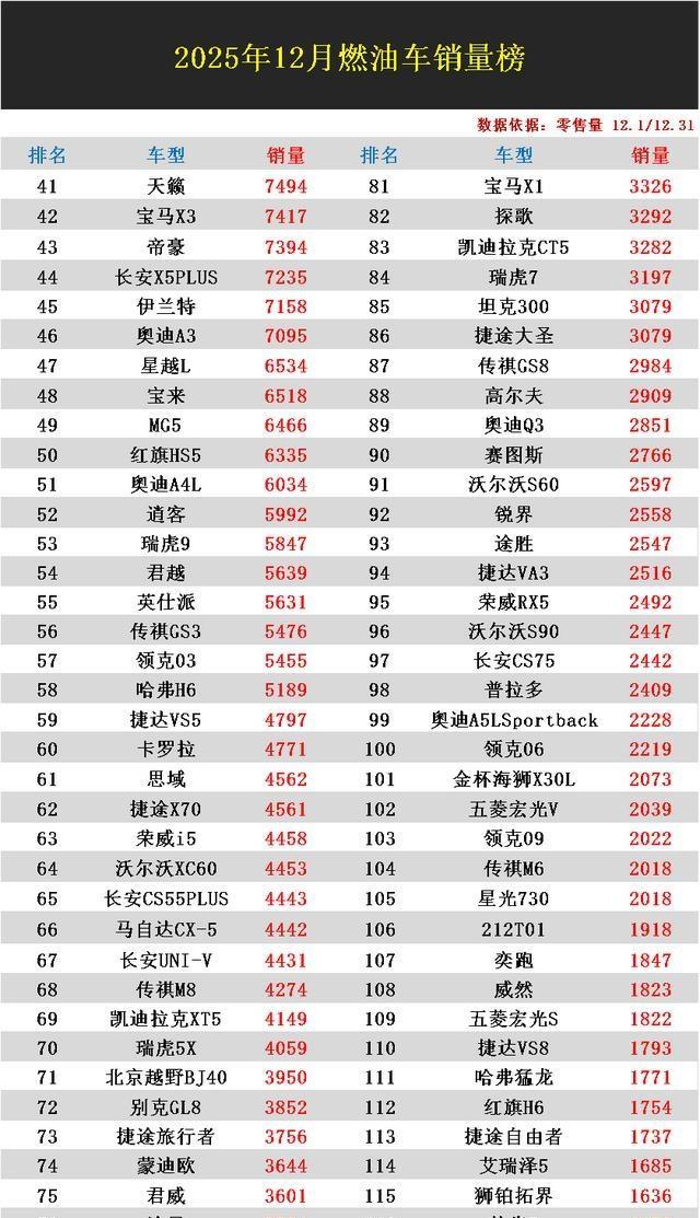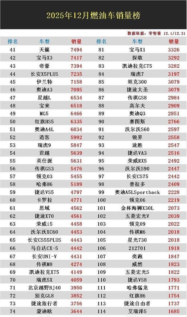 燃油车这盘菜,12月又换人上桌了。轩逸2.3万辆继续夺冠,看着还挺风光,可别急着“走路摇头晃脑”,它比上个月少卖了接近1.4万辆,这不是它突然更能打了,是整个燃油盘子在缩,冠军也得跟着“瘦身”。更扎心的是,朗逸回到第3,卡罗拉锐放冲到第2,一边是老牌合资稳稳“上桌第一个动筷”,另一边是国产SUV这轮被打得有点懵,博越L差点跌出前二十,星越L直接滑到40名开外,不少车主看完榜单估计要“气的蹦起来”。