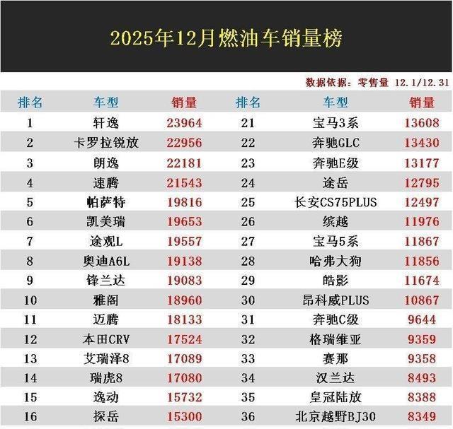 这张12月榜单,我读到的是一句话:燃油车没消失,但在加速分层。轩逸、朗逸、卡罗拉锐放这种靠口碑和体系吃饭的,依旧能在桌上先动筷;帕萨特、凯美瑞和一票豪华车靠舒适和品牌继续吃肉;国产SUV这轮被新能源挤压得更明显,博越L和星越L的下滑尤其扎心。