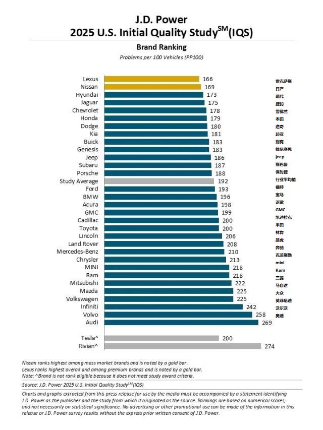 美系品牌方面,美系品牌在此次调研中呈现出较为明显的内部差异。部分品牌如雪佛兰、别克、GMC和凯迪拉克,其问题数低于行业平均值,显示出较好的新车初期质量。特别是雪佛兰,排名进入前十。然而,福特、林肯、克莱斯勒和Ram等品牌的问题数则高于平均值。此外,特斯拉与Rivian因不符合奖项评选标准未被正式排名,但其公布的数据显示问题数处于榜单末端。这一分化反映出不同美系品牌在质量控制与生产一致性方面的现状有所不同。