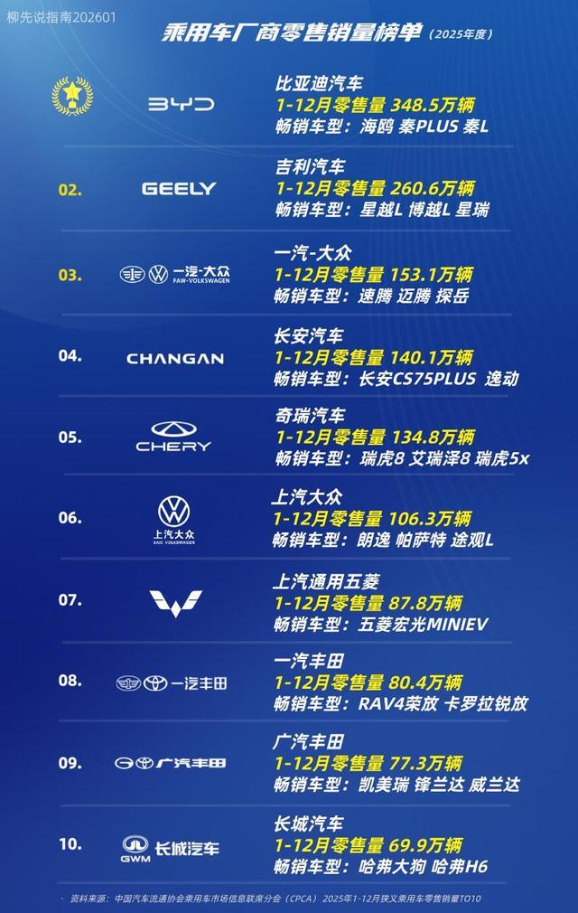 - 中国“汽车厂商”年度排名:冠军没有换,年零售量超348万台